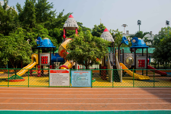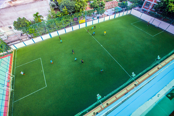 Designed for students from nursery to Grade 5, the medium-sized 5-a-side football field features artificial grass carpeting. A separate play zone with slides and swings ensures safe recreation for preschoolers.