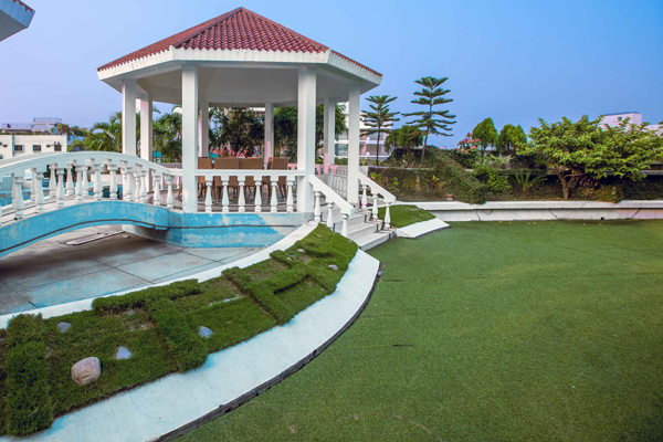 The rooftop, available for events and gatherings, features a barbecue area, seating arrangements, a decorated walkway, and a water fountain for a pleasant ambiance.